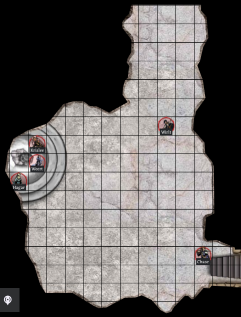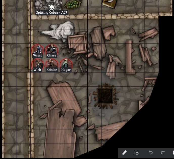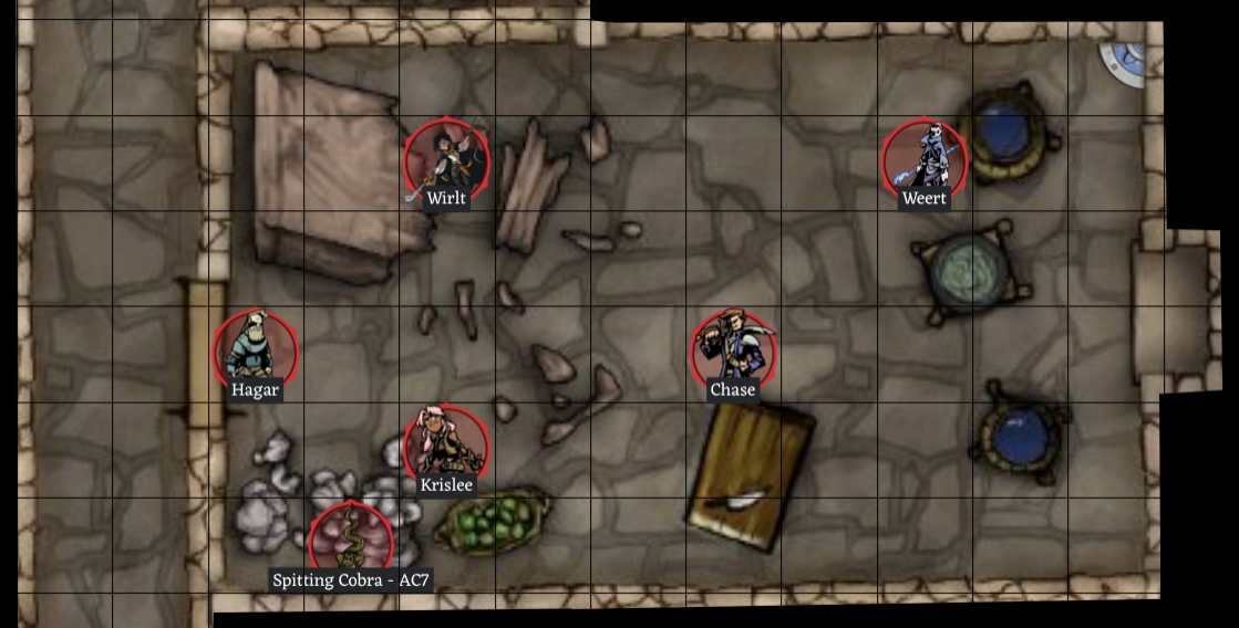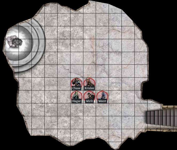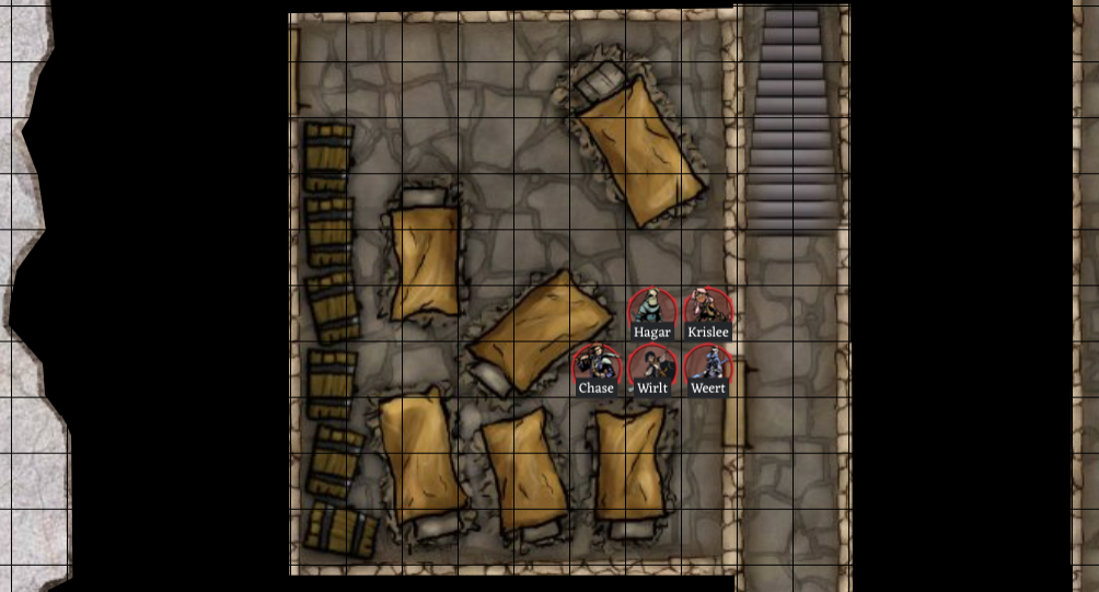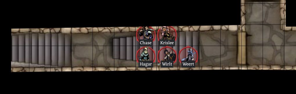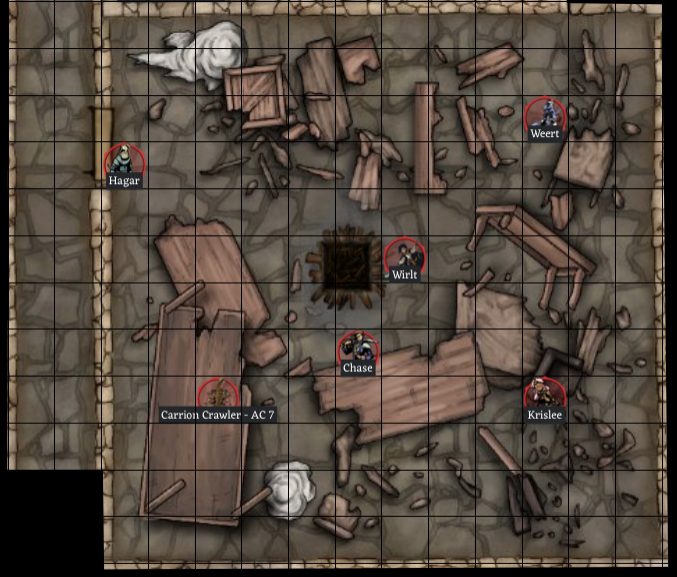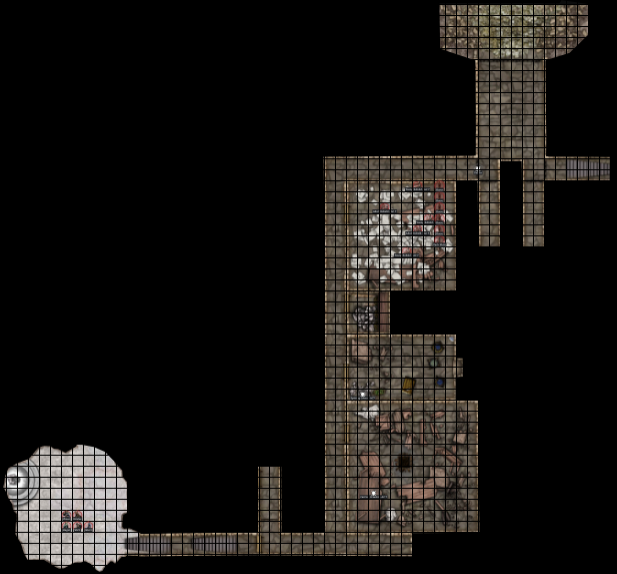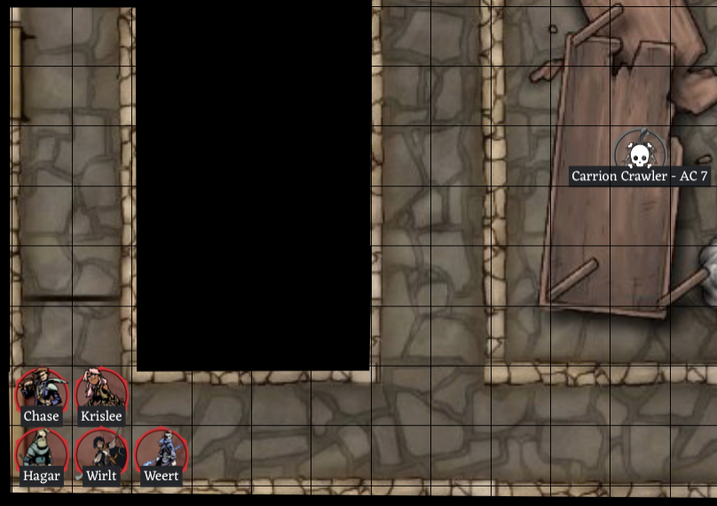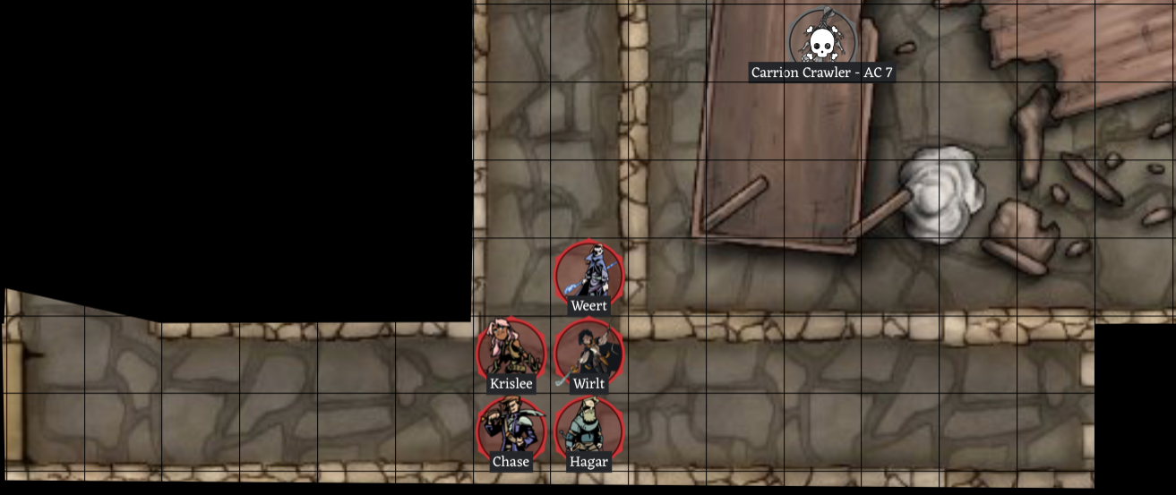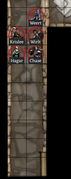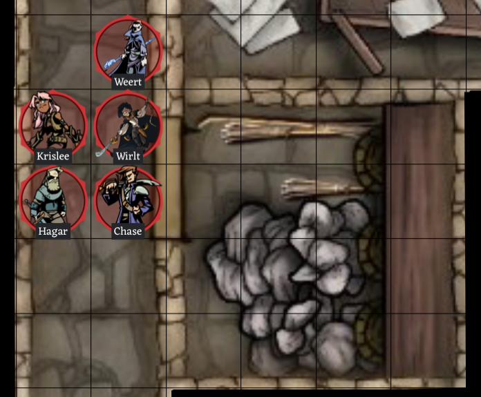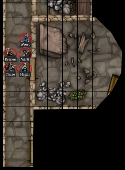 Anxious to validate the kobold’s story that there is fresh water nearby, you return down the corridor pausing at the next door beyond where the kobolds and your animals reside. The door to your left (east) appears to be barely hanging on to the hinges.