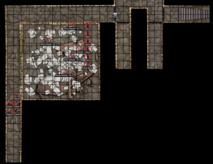 The kobold says “Gladly, friend!” He and his family get busy making the horses and the mule comfortable places to lay down by collecting papers from around the room. They stop only to eat ravenously when you provide them with some food.