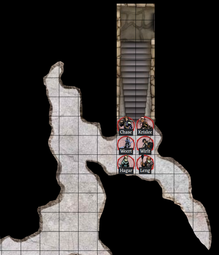 — Leng is not affected, although you’d think the stench would wake him up. — Hagar fails his saving throw, so is now at a -2 to attack and damage this round. — Chase makes his saving throw, and in fact feels better than he has in quite a while (rolled a nat 20). He maybe even enjoys the smell a little 😀 — Wirlt fails her saving throw badly, and is barely able to keep her lunch down. She will attack at -2 to hit and damage. — Weert also fails his saving throw and has a -2 to hit and damage, but he is out of weapons or attacks, so just hangs out at the top of the stairs trying not to throw up. — Krislee fails her saving throw and will also have the -2 to hit and damage, and is just not happy with the whole situation.