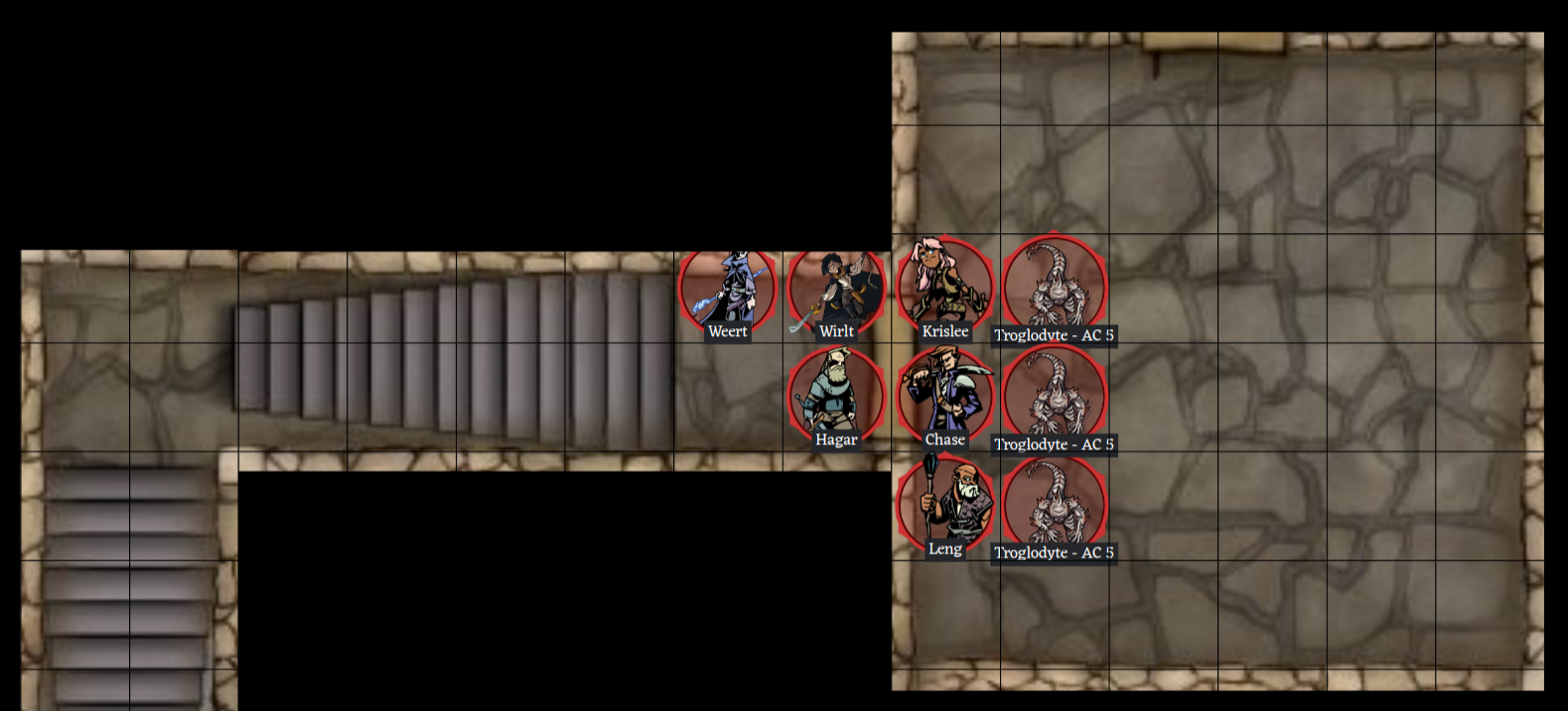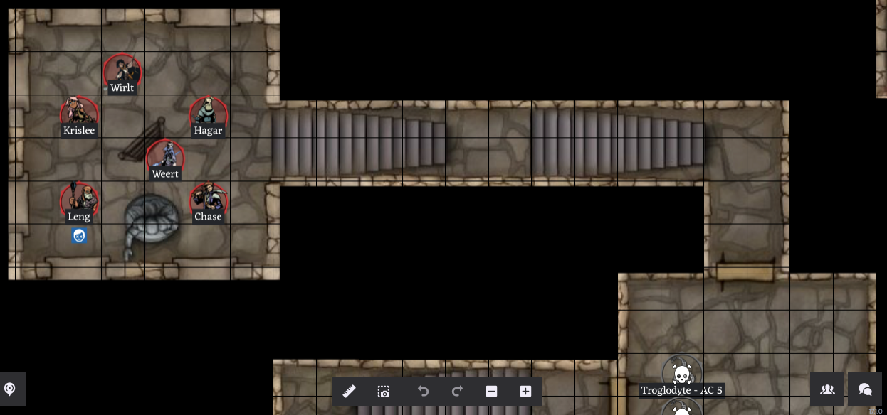 • Wirlt valiantly fights through the extreme nausea and stabs the northernmost Troglodyte through the heart for 3 hp damage, killing it! 🎈 You all breathe a sigh of relief (and gain 18 XP each), but then immediately regret it - these Troglodytes are just filthy stinky! You managed to search the room and the bodies, but find nothing of value. Next Step: