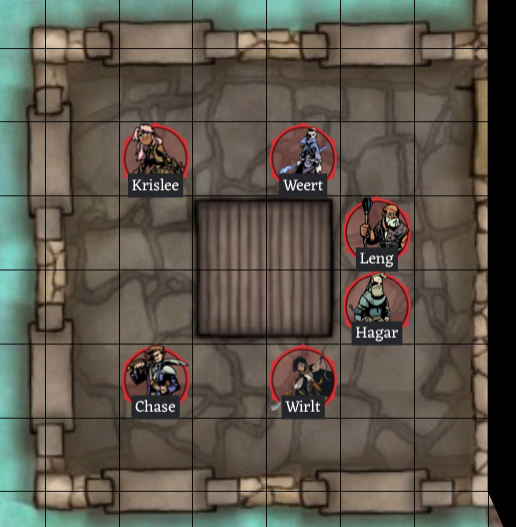 • Chase, still shaking off his bad swing from last round, is able to get up and move to stand over Leng to protect him from further harm. Chase is not able to attack this round though.