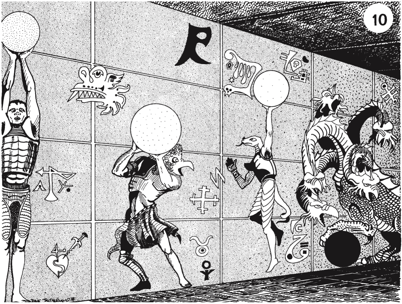 Old Man from Scene 24 then cast Dispel Magic on the archway, which continued to glow and the mists remained. The party then walked through the archway, finding a small room beyond. Searching for secret doors, no one was able to find them or anything else beyond the archway.